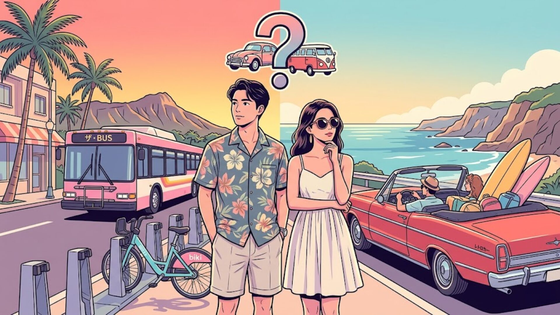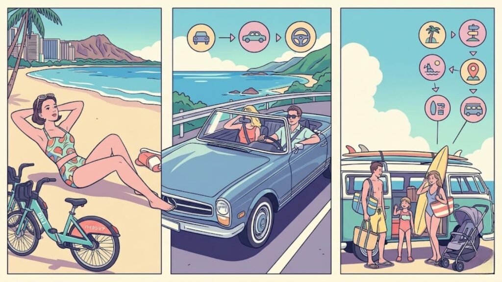 GoHawaiiが公共交通・ライドシェア・バイクシェア・ツアー・レンタカーを並列で案内し、レンタカーを「必要なときの選択肢」として位置づけている点から見ても、オアフは”毎日借りる前提”で考えなくてよい島です。