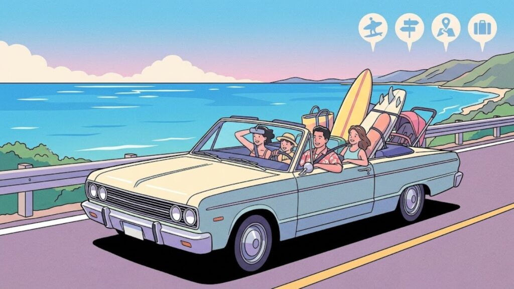 小さなお子さん連れ、ビーチ用品やベビーカーがある旅行、荷物が多い旅行では、レンタカーの負担軽減効果が大きくなります。
