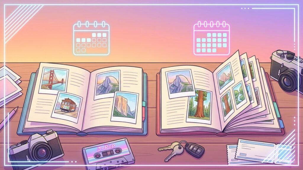 | 宿泊費の構造 | 市内泊を挟むと1泊増えやすい | 到着日からYosemite方面へ入りやすい |
