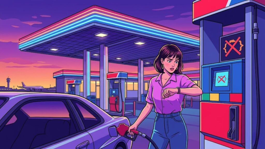 フライト時間が迫っている中、暗い時間帯に見知らぬ土地でガソリンスタンドを探し、給油機のトラブル(後述)に巻き込まれるのは最悪のシナリオです。