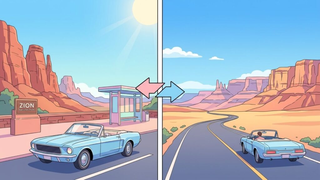 「Zionはレンタカー不要」と一言で片づけるより、Zion現地では不要になりやすいが、旅全体では必要になることも多いと考えるのが、いちばん実態に近い見方です。